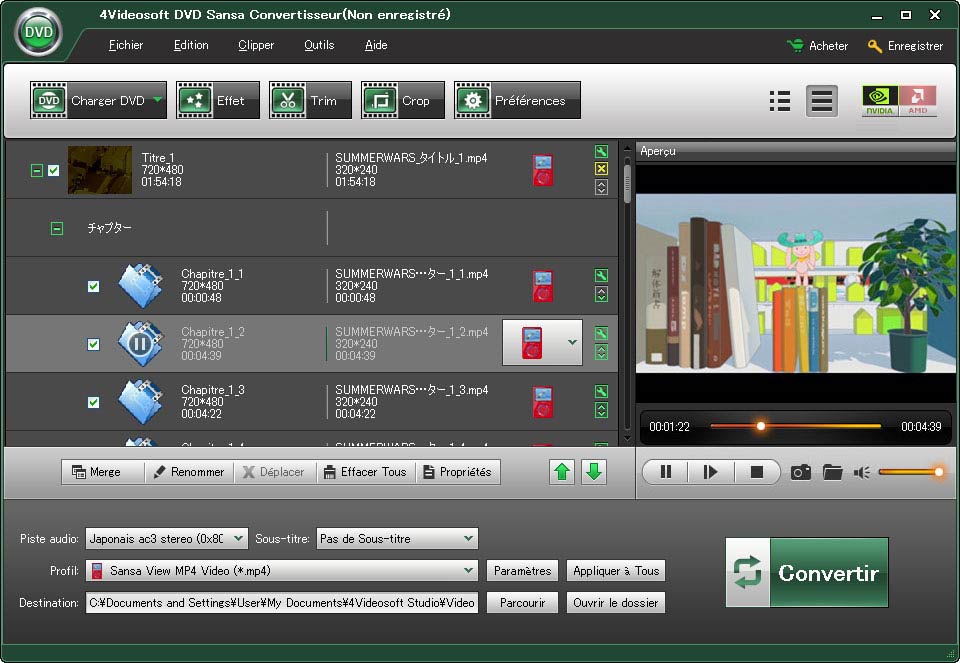 DVD Sansa Convertisseur peut convertir DVD à Sansa MP4, convertir DVD à WMV, AVI pour les autres appareils et ripper les films DVD en Sansa MP3, WMA, OGG avec la qualité sonore et image de sortie sans perte.
